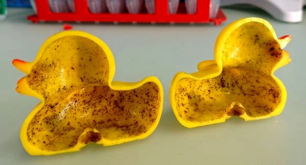 اسباب بازی های استفاده شده در حمام مثل اردک های زرد، در درون خودشان در هر دو سانتی متر مربع بین 5 الی 75 میلیون سلول قارچ و باکتری های خطرناکی مانند لِژیونِلا و سودوموناس آئروژینوزا دارند که درصورت راه پیدا کردن به بدن انسان می توانند کار را به بیمارستان بکشانند.